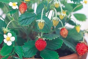 タネから育てるイチゴで、実は2~3cmと小粒ですが食べられます。株を大きくすると甘味が増します。